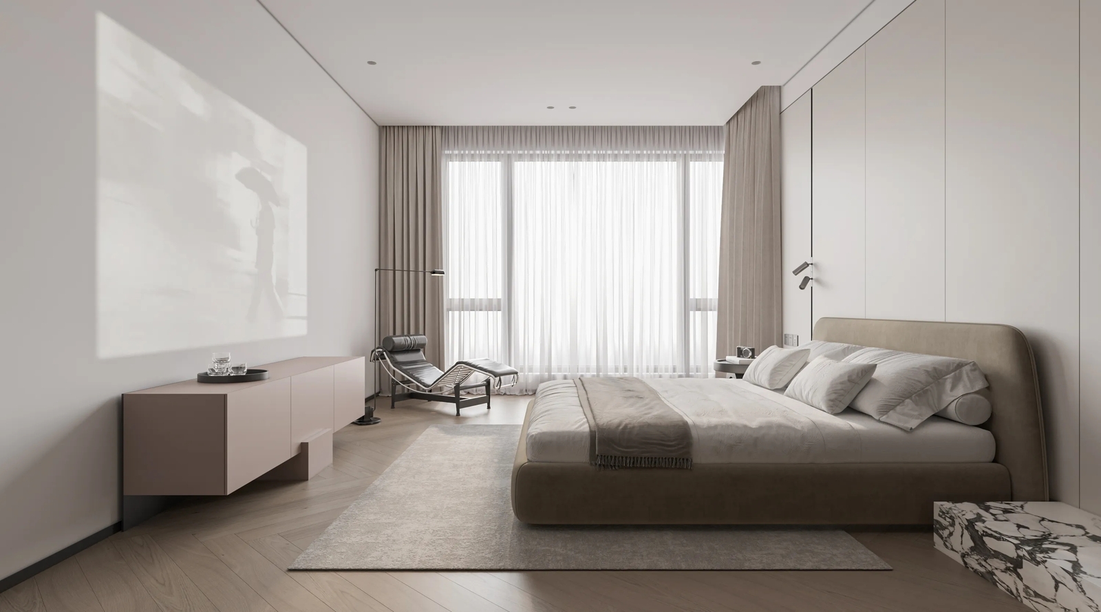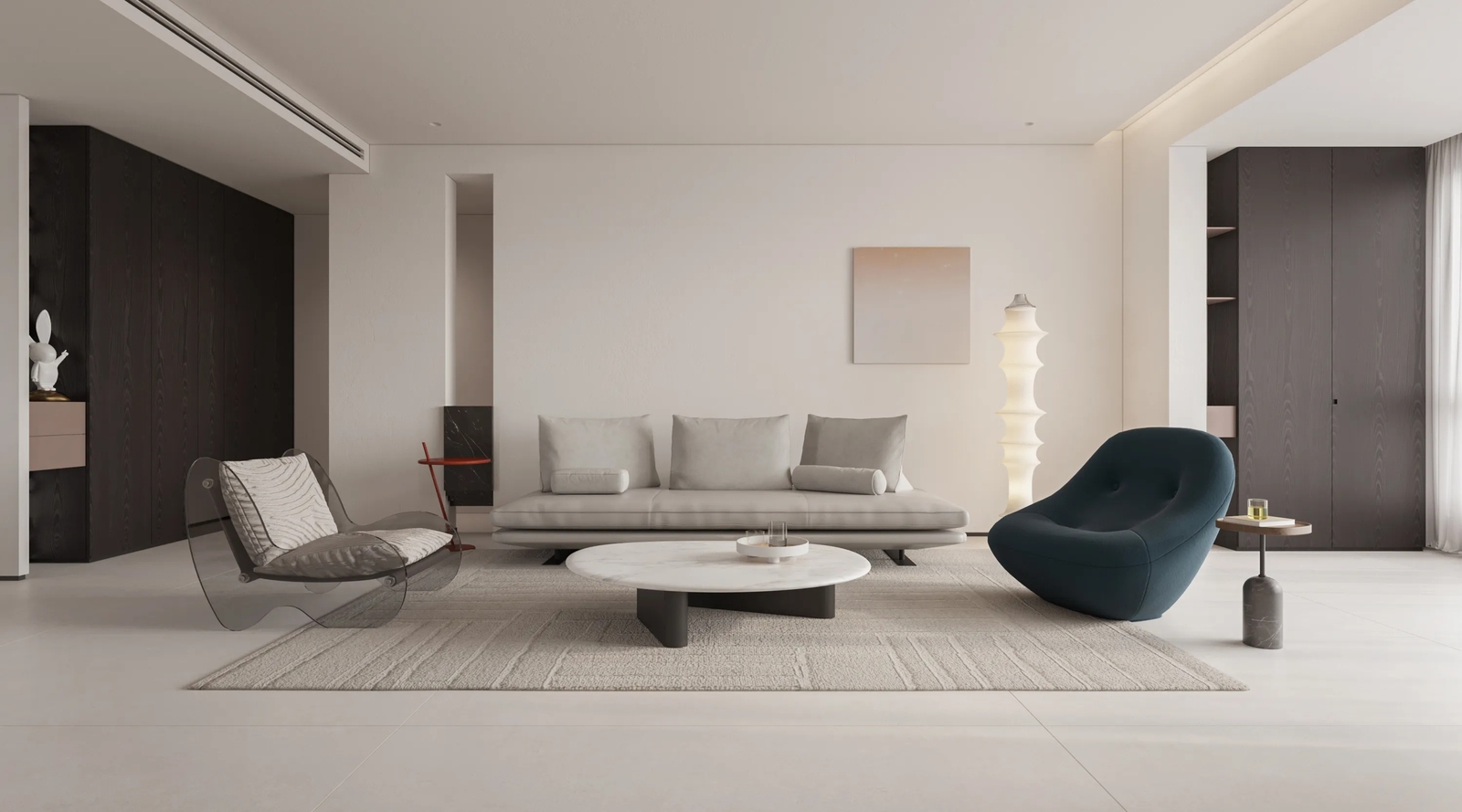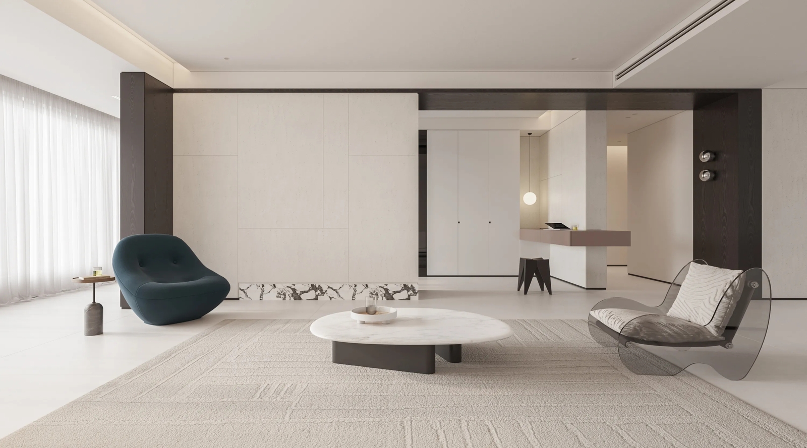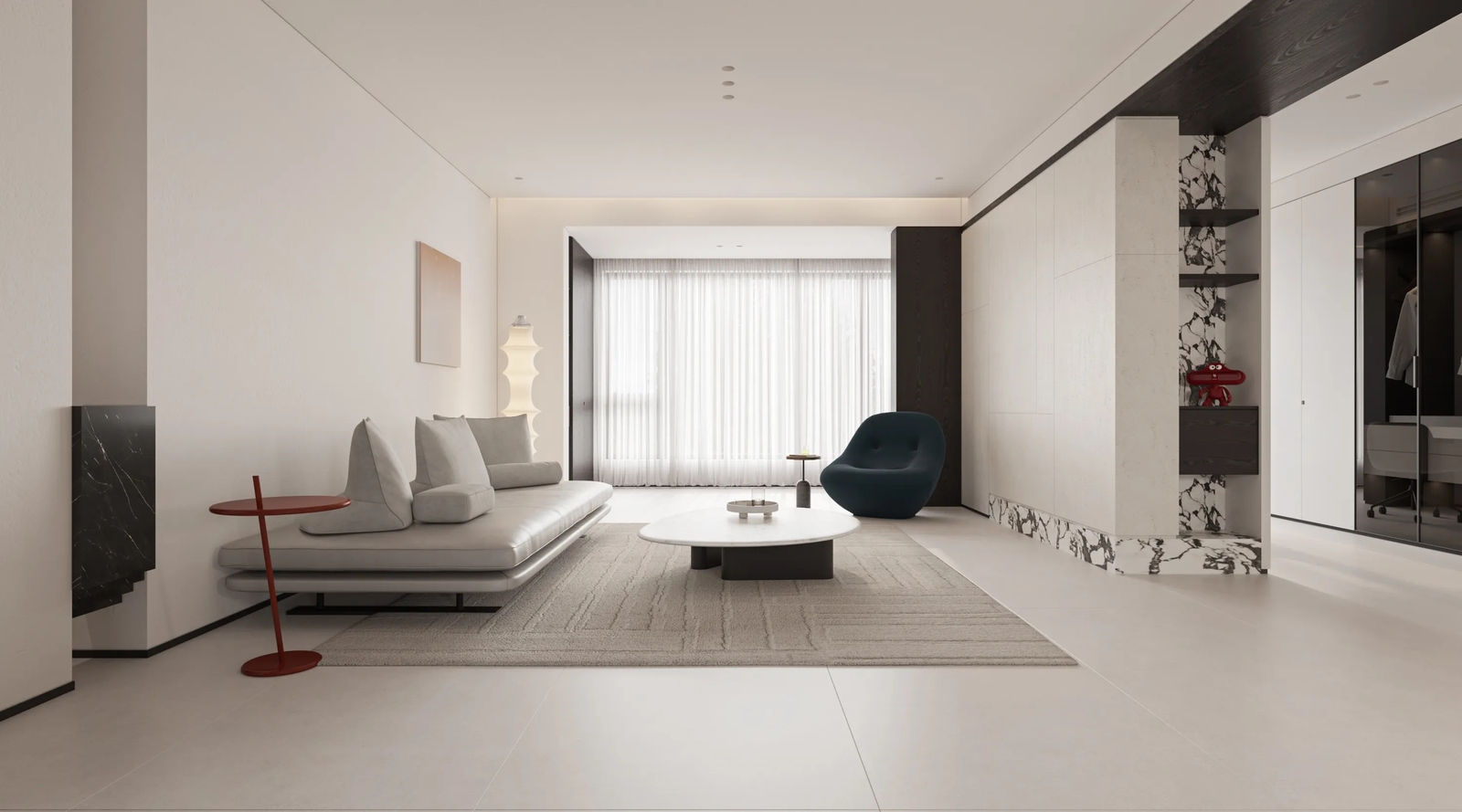 低靠背悬浮沙发、异形大理石茶几、轻盈的休闲椅,造型简约却不单调,兼顾颜值与舒适度;隐形门+通顶柜体,让墙面更完整,整洁度直接拉满。