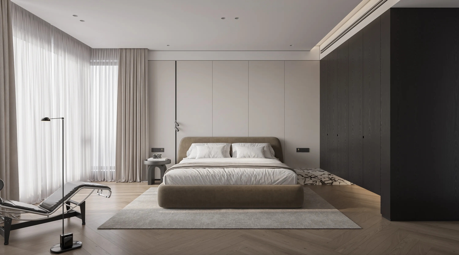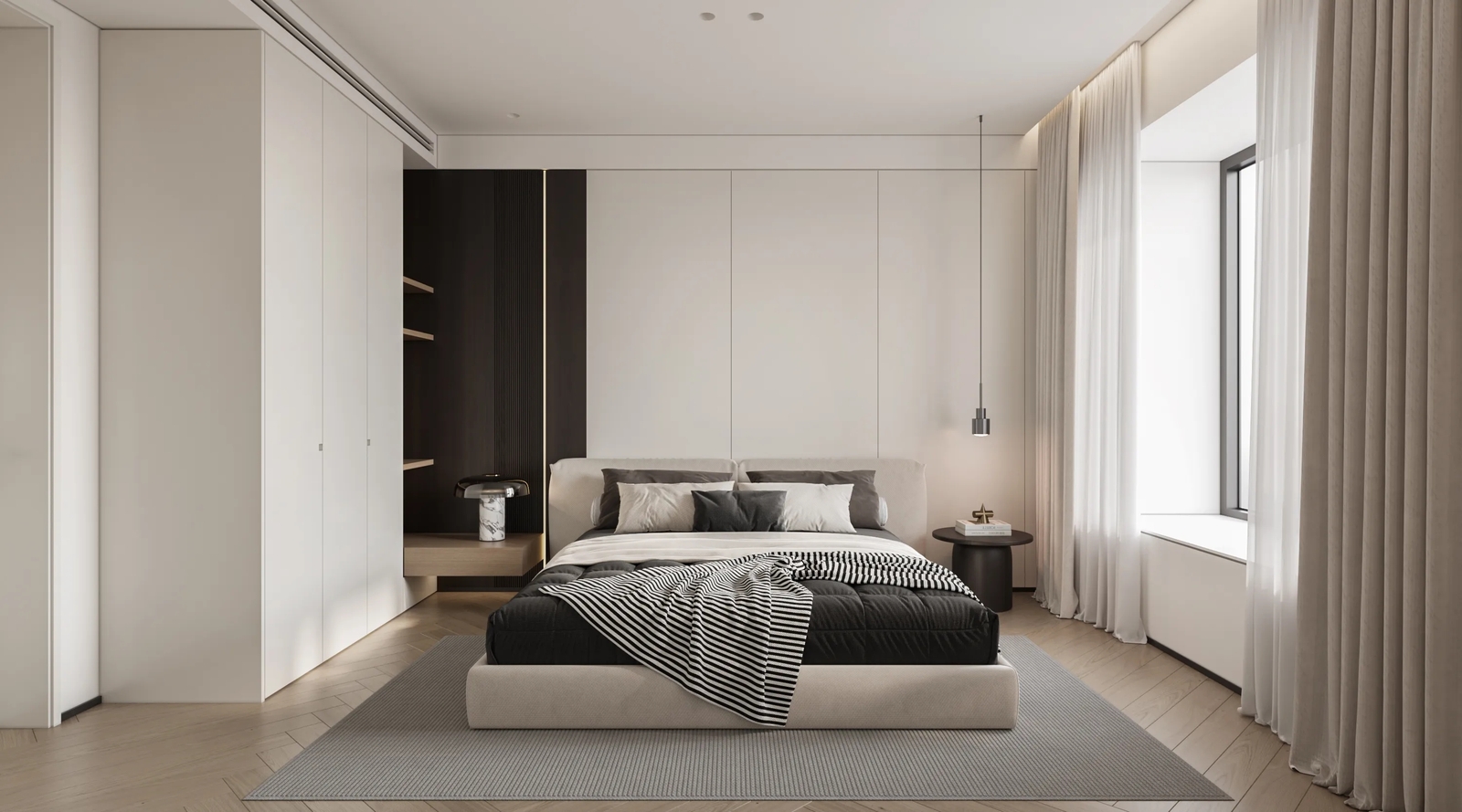 无主灯+线性灯组合,搭配床头硬包/木饰面,营造柔和睡眠氛围;通顶隐形衣柜与墙面融为一体,收纳拉满还不占空间。
