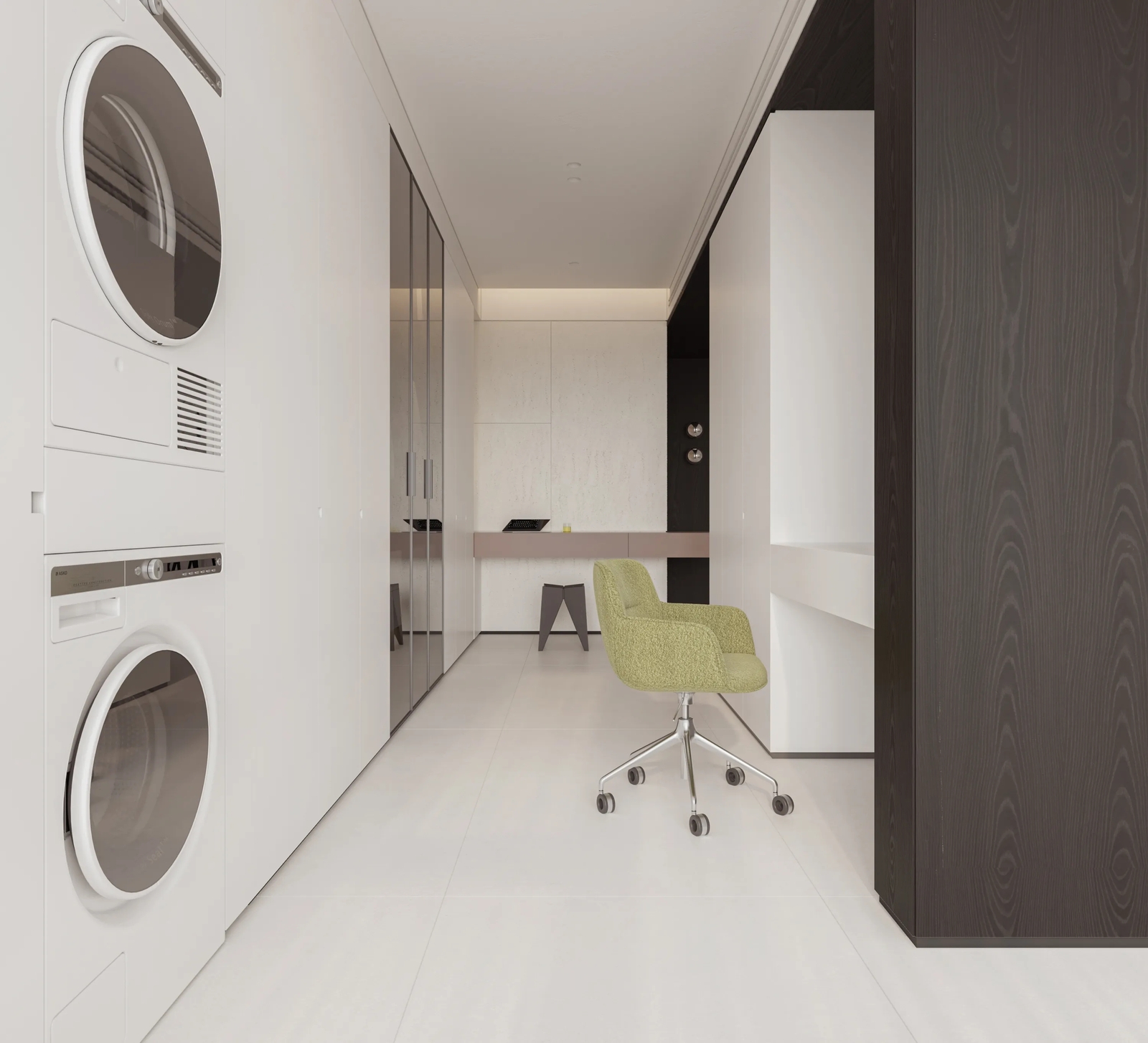 家政区嵌入洗烘套装,通顶玻璃柜+储物柜,收纳清洁用品一目了然;一体化办公区设计,兼顾工作与家务,动线合理不鸡肋。