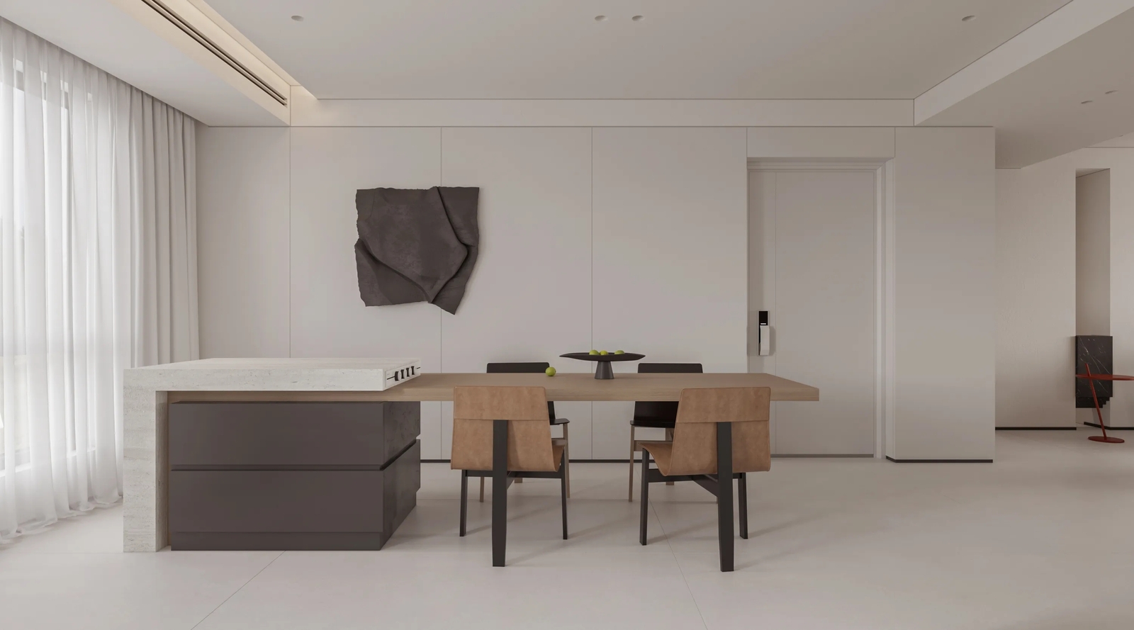 悬浮吊顶+线性灯槽,柔和光线不刺眼,完美保留顶面简洁感;客餐厅一体化设计,用浅灰地毯划分区域,视觉上放大空间,动线流畅无阻。