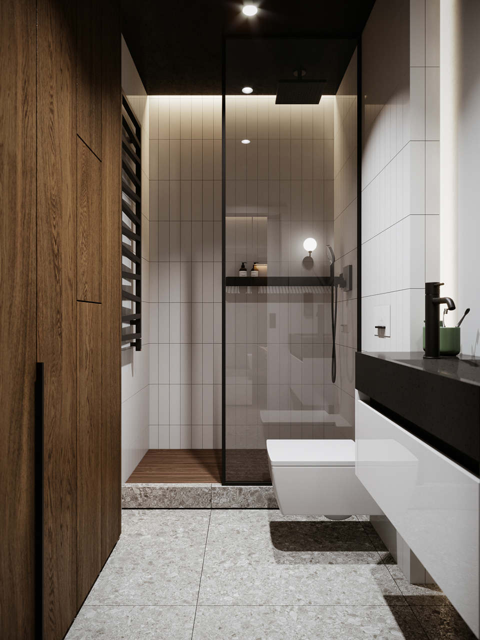 卫浴位于入门的右手边,由于空间限制我们采用吊轨式推拉门,卫浴空间以白色为主色调,搭配黑色的五金器具,进门右手是方形简约的黑白洗漱台,左手边我们安置了一个超大的防潮浴室柜,将洗衣机、烘干机安置于其中。