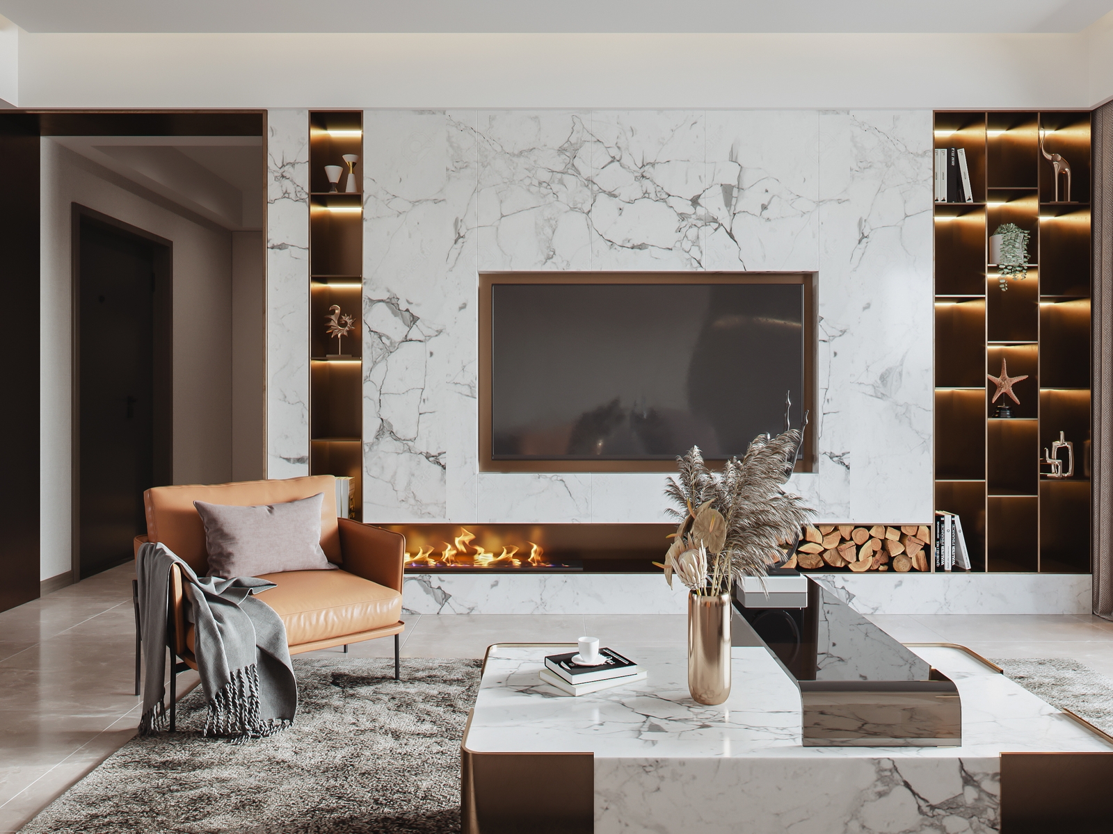 灯光是隐形的软装:拒绝刺眼的主灯,用嵌入式筒灯+磁吸轨道灯+壁灯做基础照明,再加上背景墙的壁炉氛围灯、展示柜的嵌入式灯带,光线层层叠叠,既满足照明需求,又让空间像被柔光滤镜包裹;